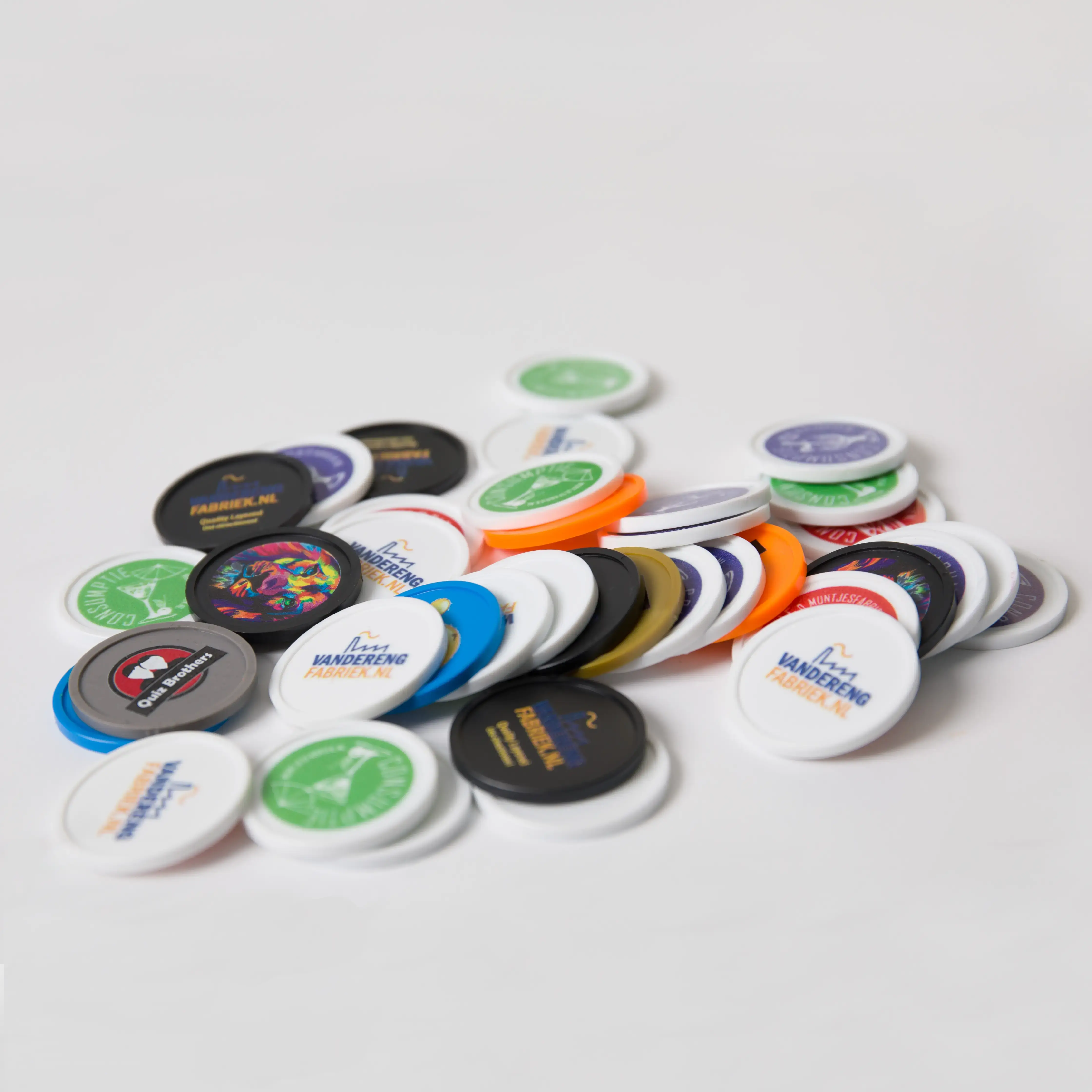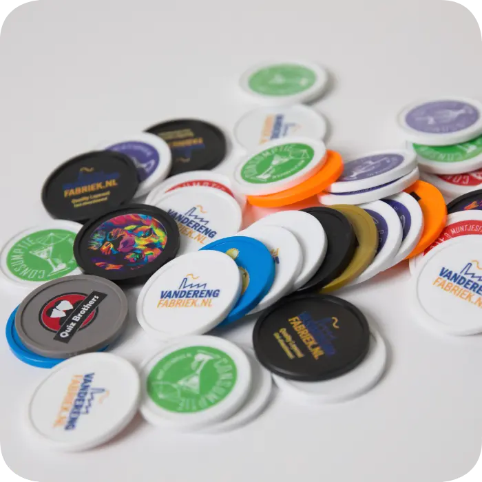 Bij De Muntjesfabriek heb je volledige vrijheid in het ontwerp van je muntjes. Jij kiest het type muntje, de kleuren en de bedrukking. Zo sluiten de muntjes altijd aan bij je huisstijl, event of toepassing.